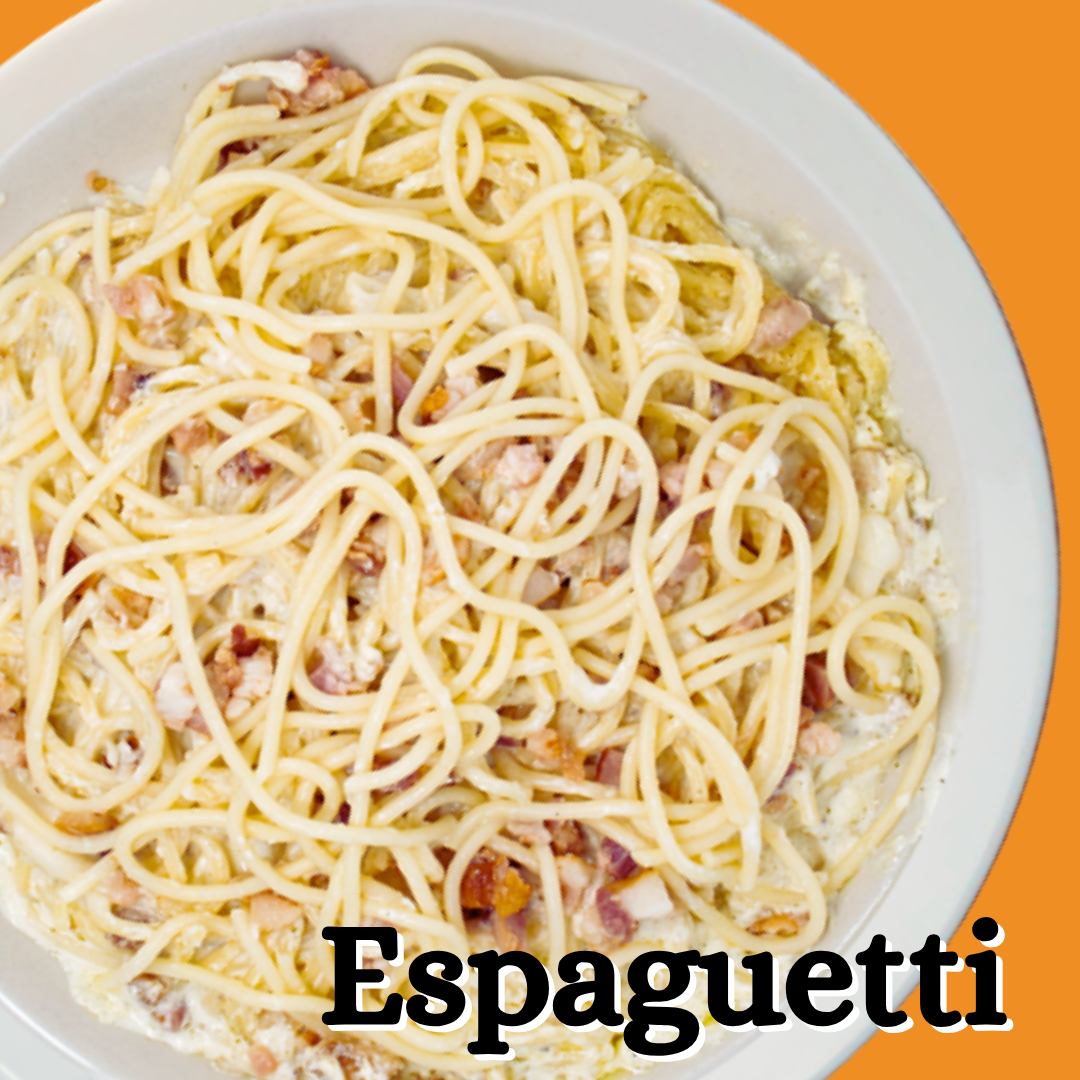Espagueti con salsa alfredo con tocino y queso parmesano.