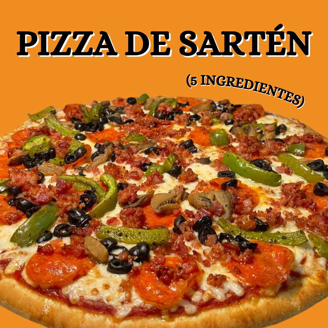 Pan artesanal con pepperoni, champiñones, pimiento morron, aceituna negra, tocino y queso Mozzarella