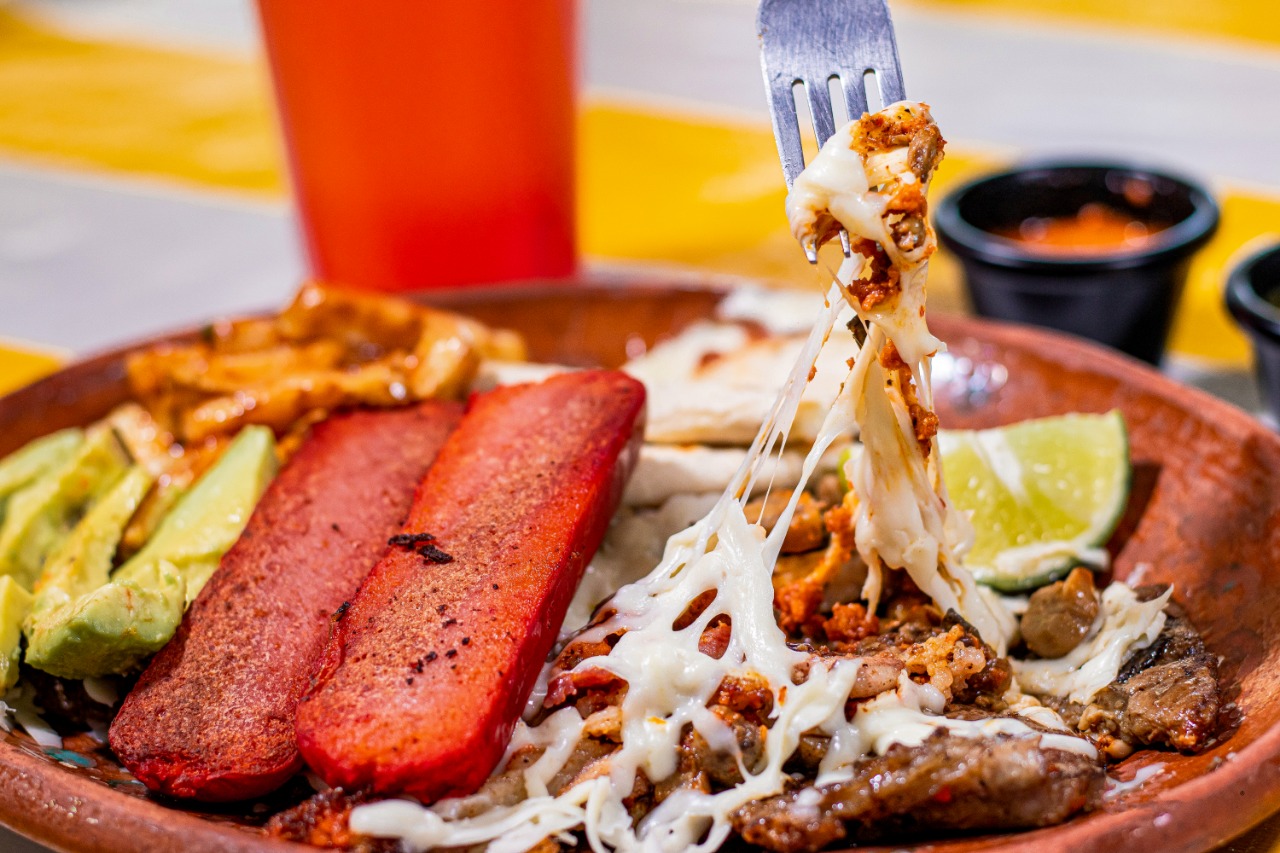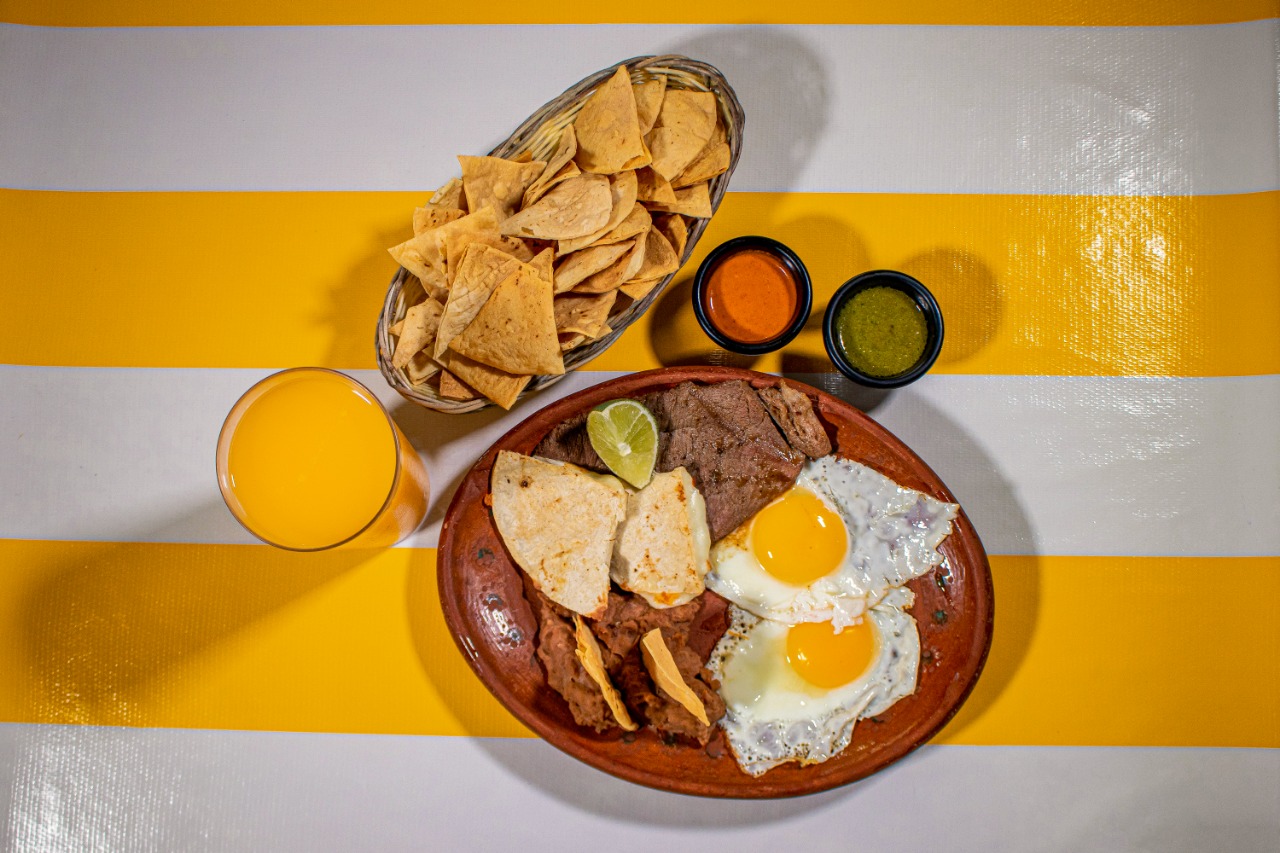 Huevos al gusto, carne asada, quesadilla maíz y frijolitos refritos.