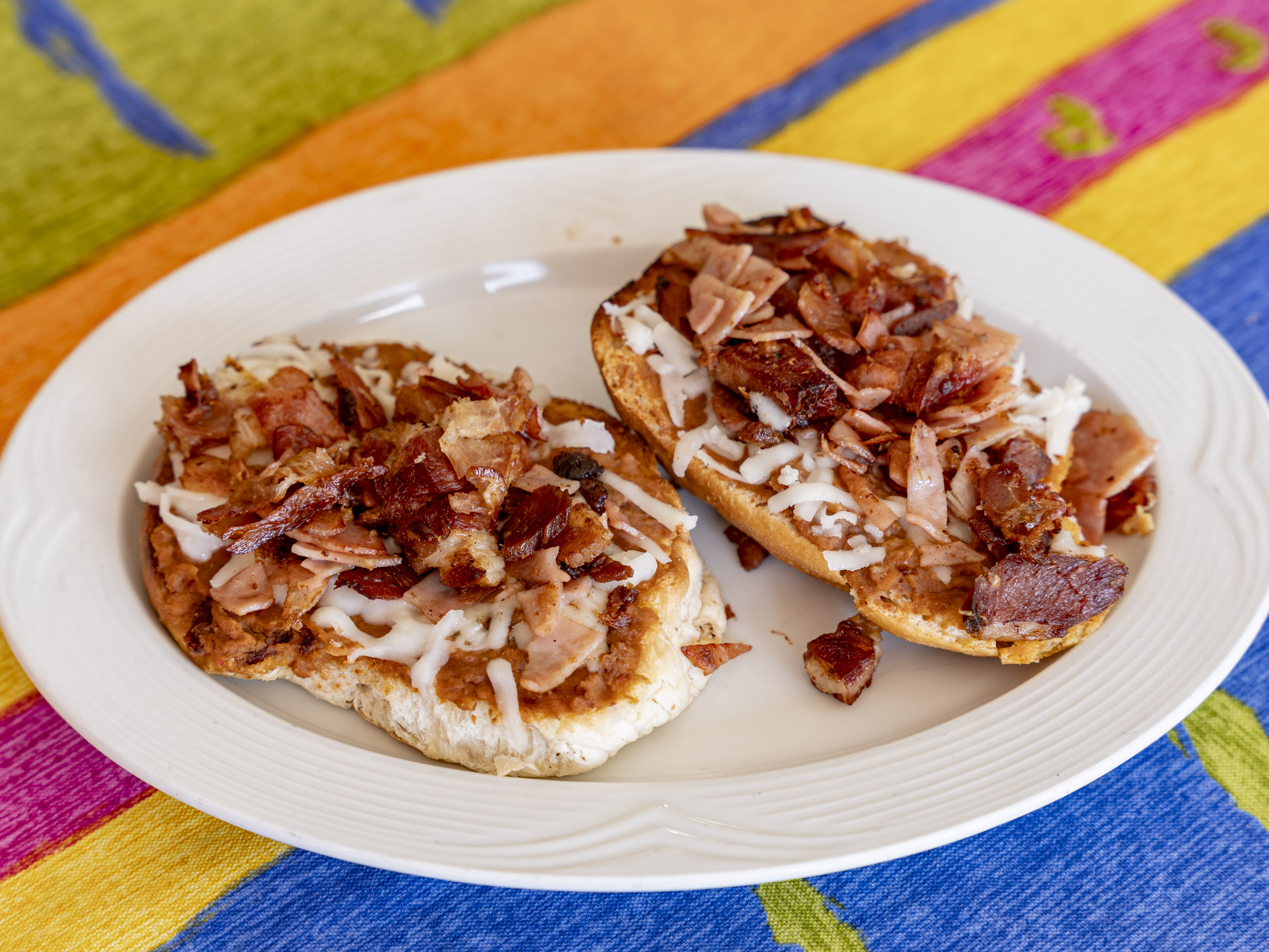 Dos deliciosos molletes coronados con dos huevos estrellados y salsa de rancheros.