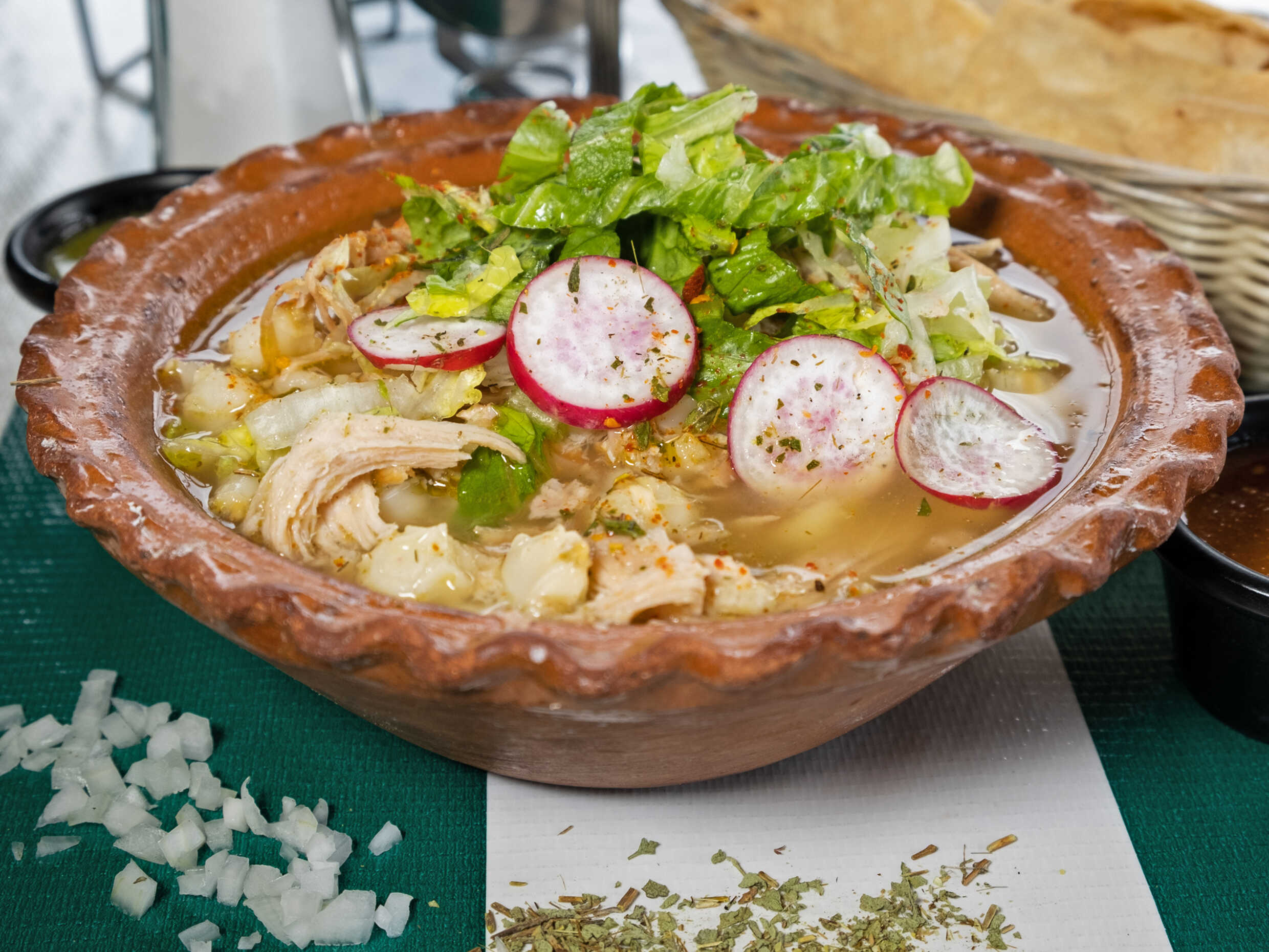Delicioso pozole verde de puerco, con una pieza de pan blanco, más complementos.