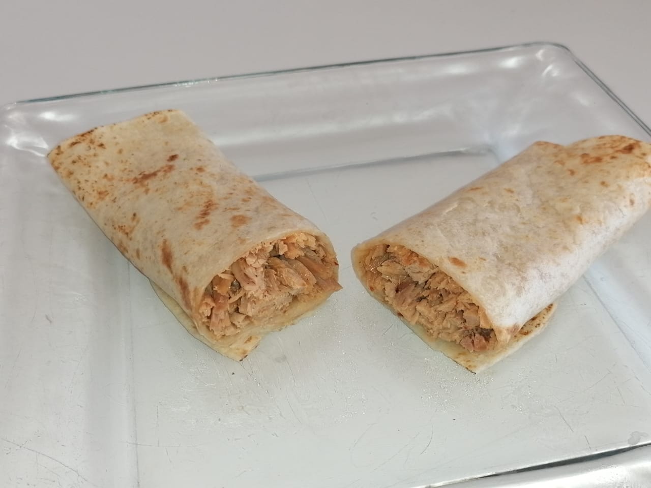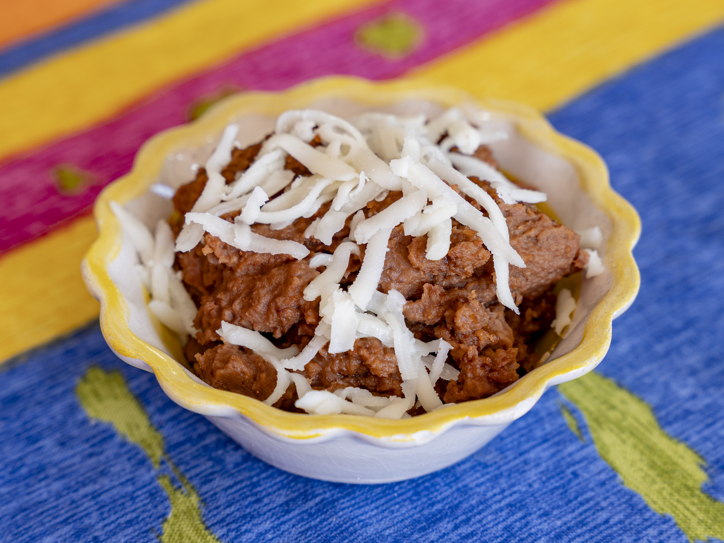 Tortilla de harina, frijolitos refritos y queso chihuahua.