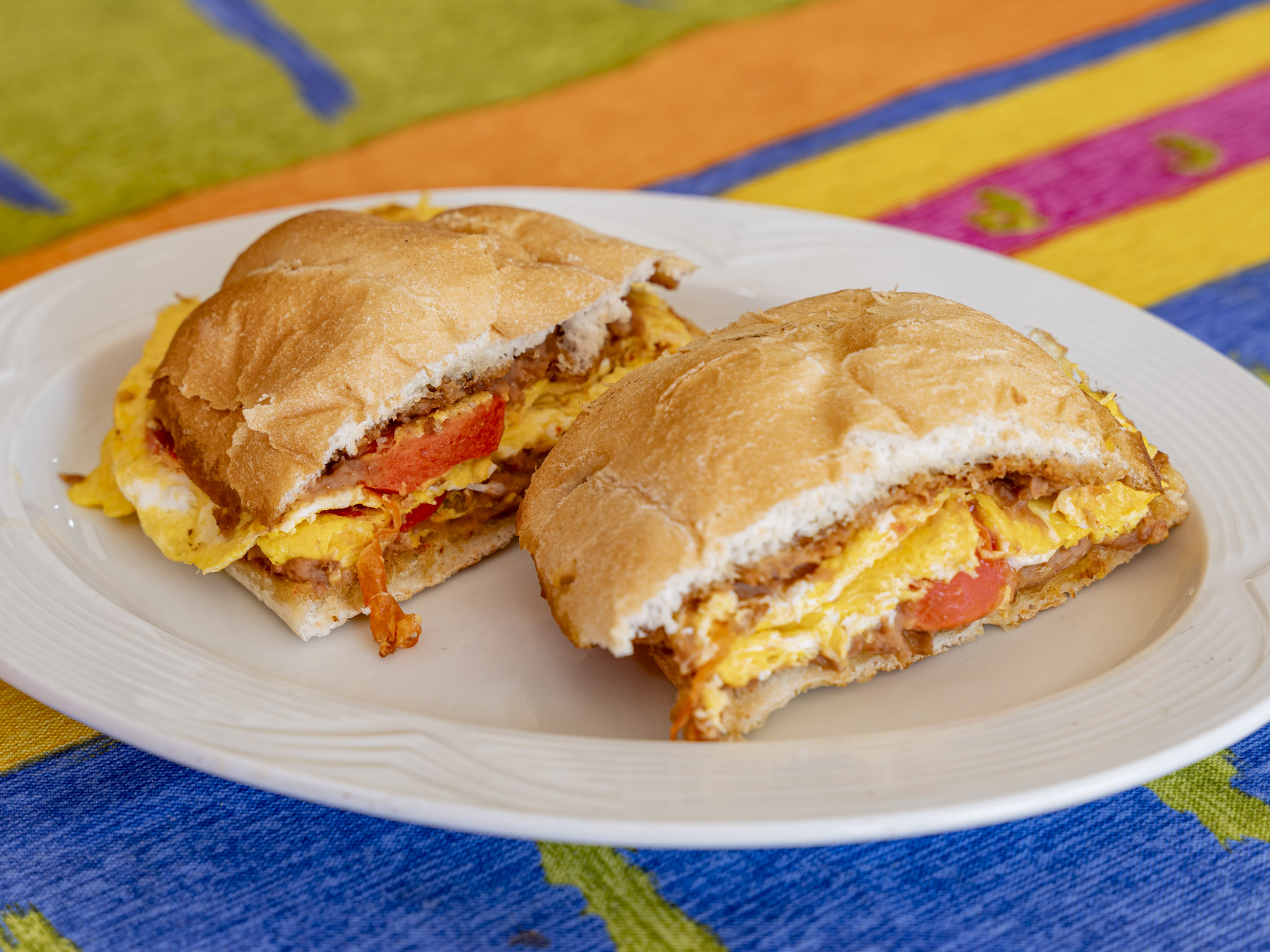 Pan doradito, dos huevos, salchicha campestre, queso y frijoles refitos.
