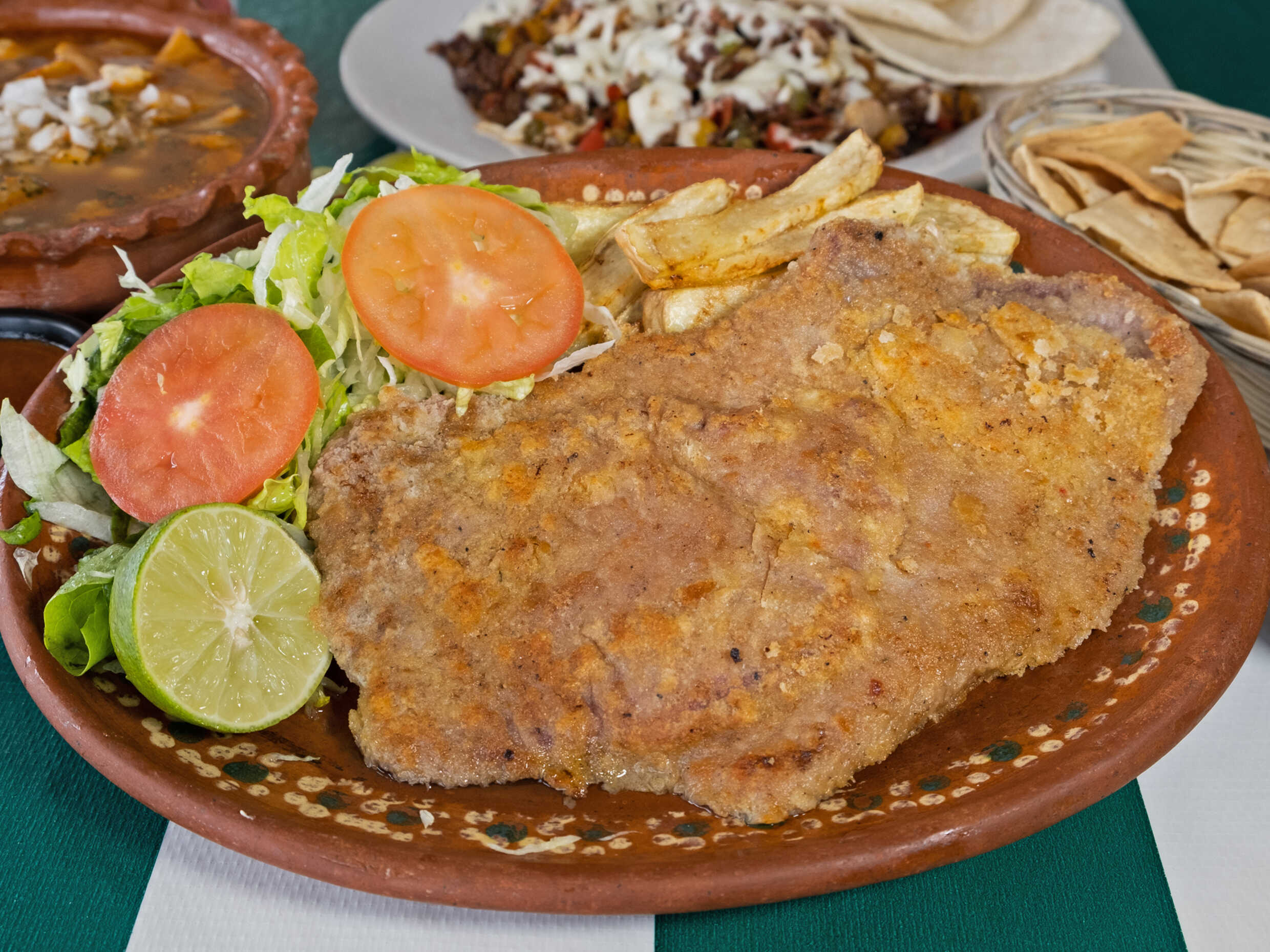 Rica milanesa de res acompañada de papas francesas y verdura.