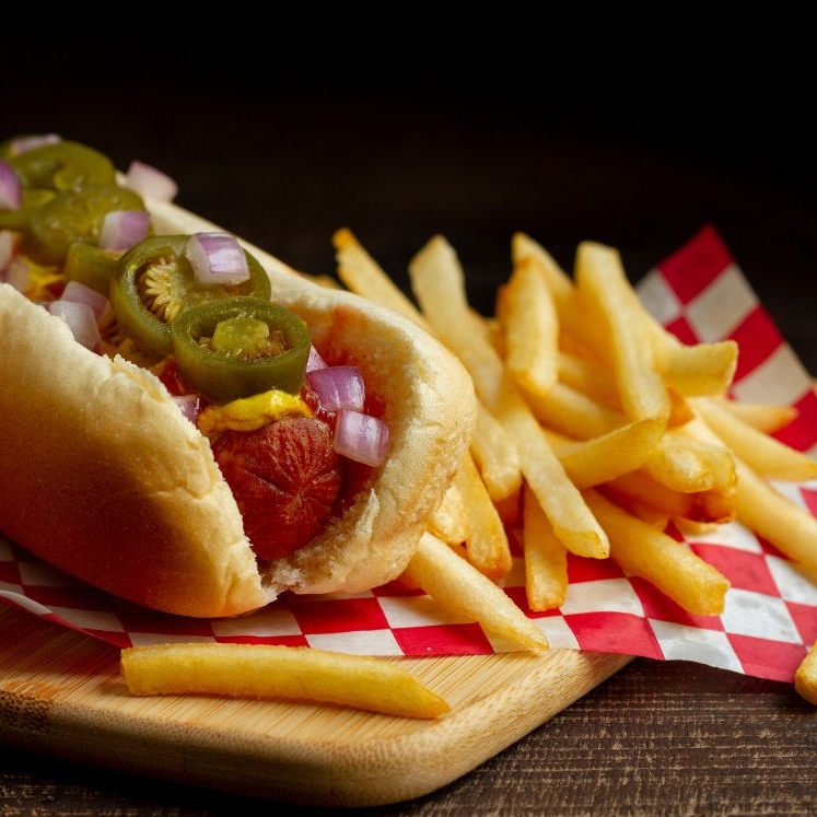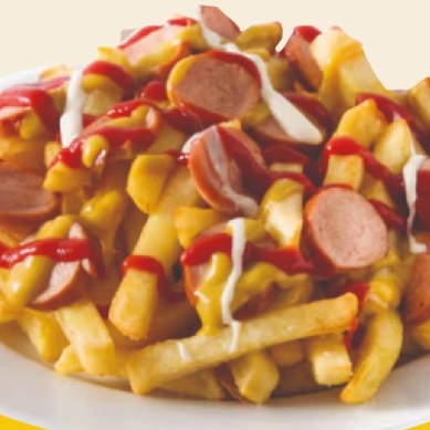 Trocitos de salchicha con papas a la francesa y aderezos