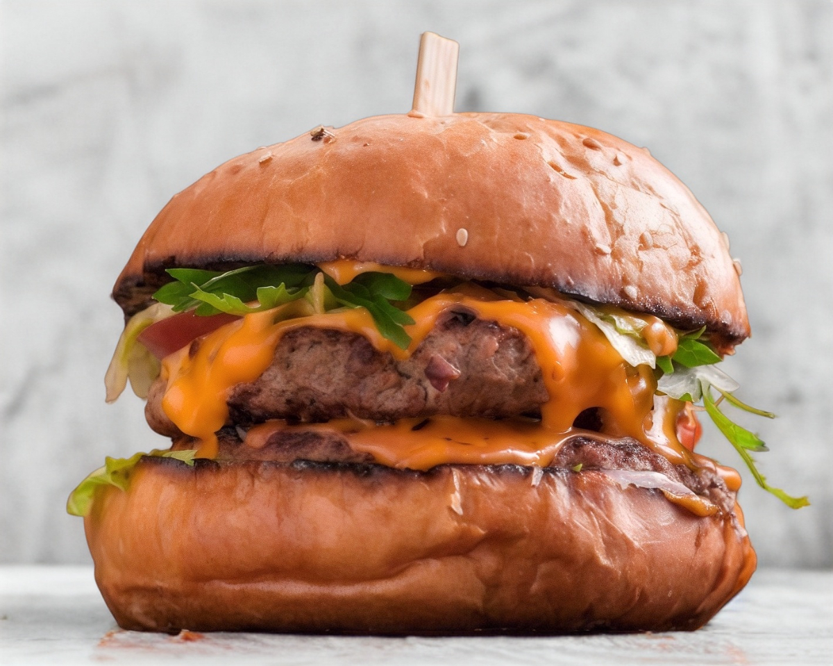 Pan lechuga y Con 2 carnes de hamburguesas bañadas en queso amarillo, topping, cátsup