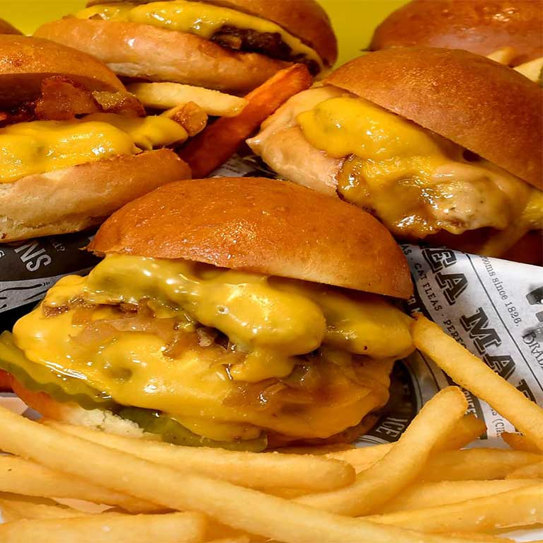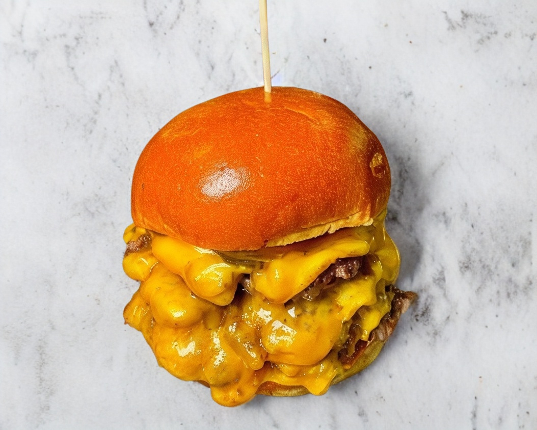 Carne de hamburguesa bañada en queso amarillo, topping de salsa.
