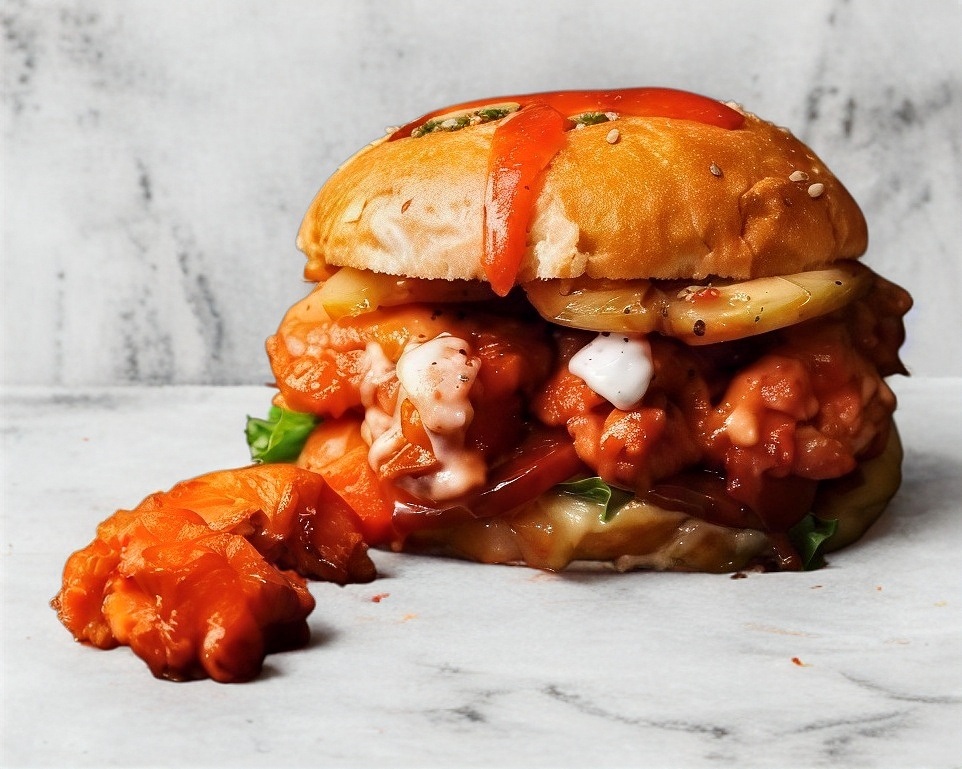 carne de hamburguesa bañada en salsa de la casa de chipotle, tocino, lechuga y tomate