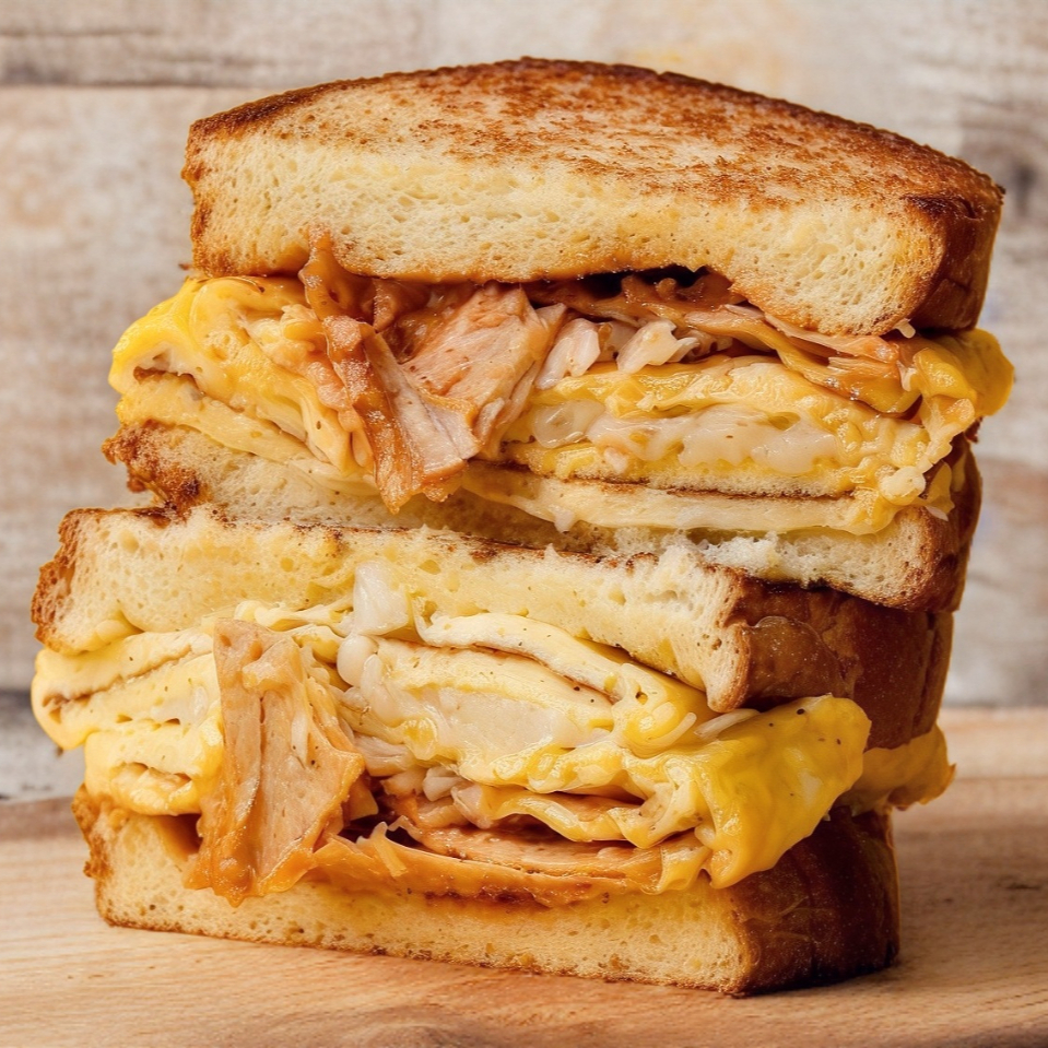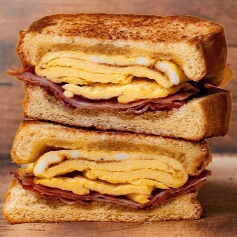 Pan brioche, miel maple, huevo revuelto, jamón y tocino.