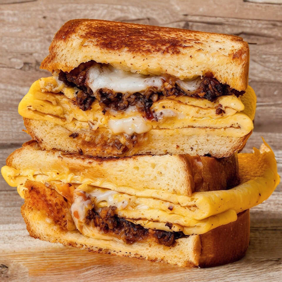Pan brioche, mayonesa, huevo revuelto, queso, chilaquiles verdes o rojos, crema, cebolla y cilantro.