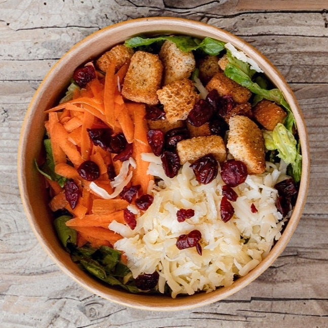 Lechuga orejona, arándanos, zanahoria, crutones, queso, res y ranch.