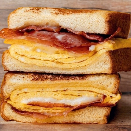Pan brioche, mayonesa, huevo revuelto, queso, jamón y tocino.