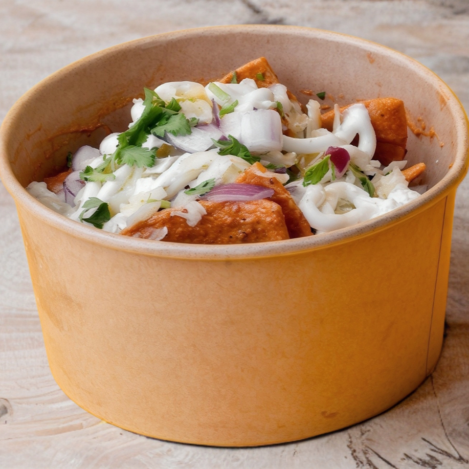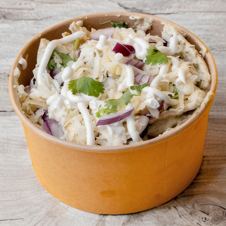 Totopos bañados en salsa roja acompañados con queso, cebolla morada, cilantro y crema. (Muy Picantes)