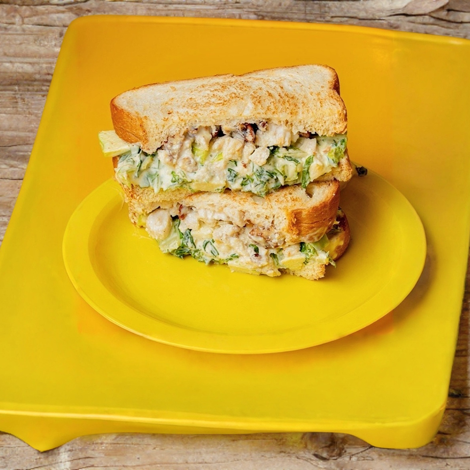 Pan brioche con ensalada de pollo manzana, lechuga, cilantro y nuez