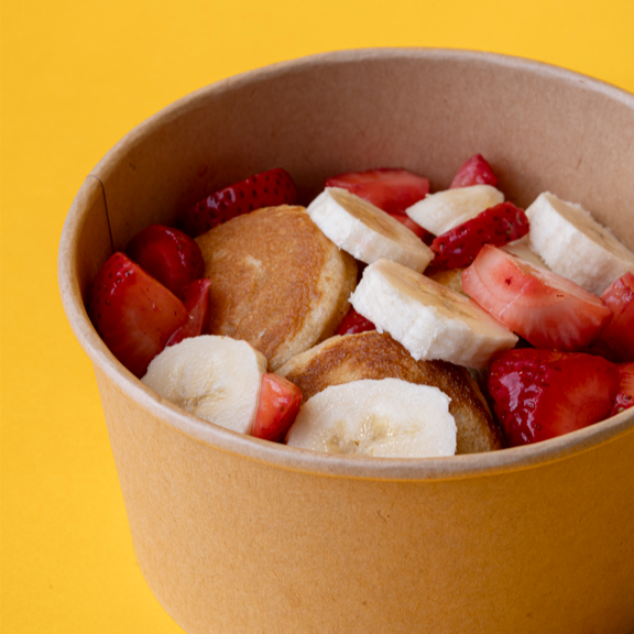 12 Mini pancakes acompañados de una fruta (plátano o fresa) con miel maple y un topping a elegir.