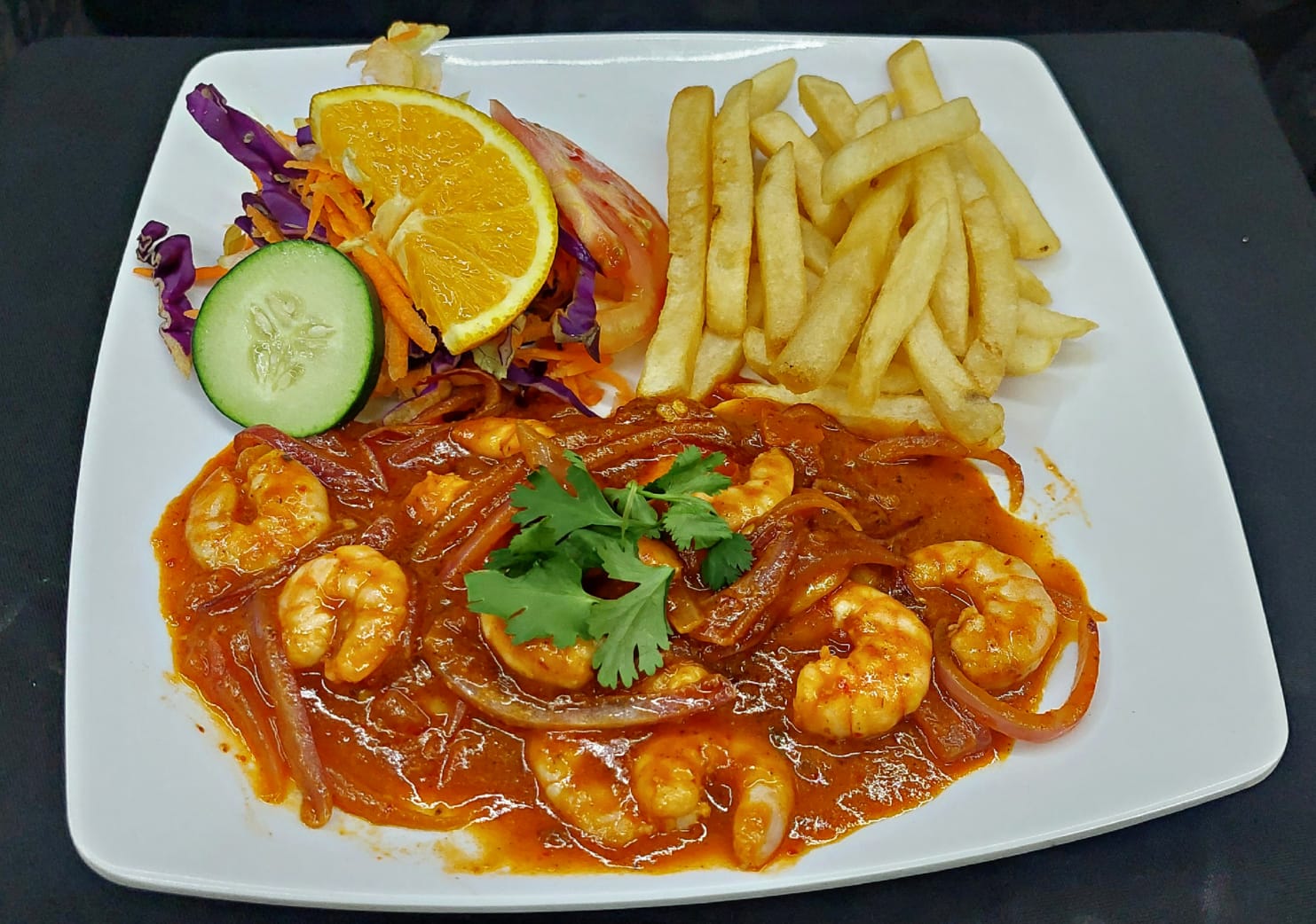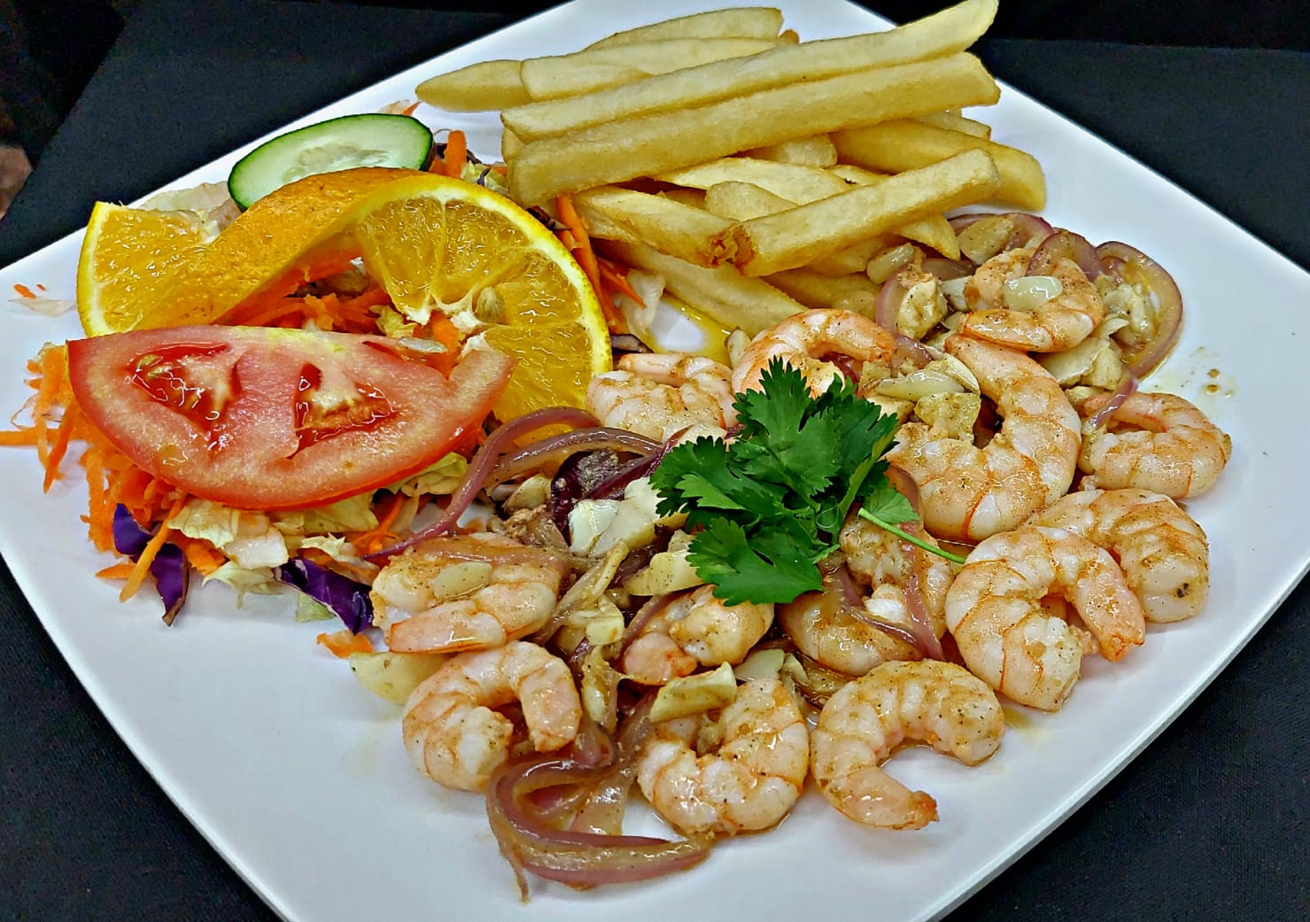 Marlin salteado con mantequilla, cebolla, tomate y chile. Acompañado de arroz, papas y ensalada.