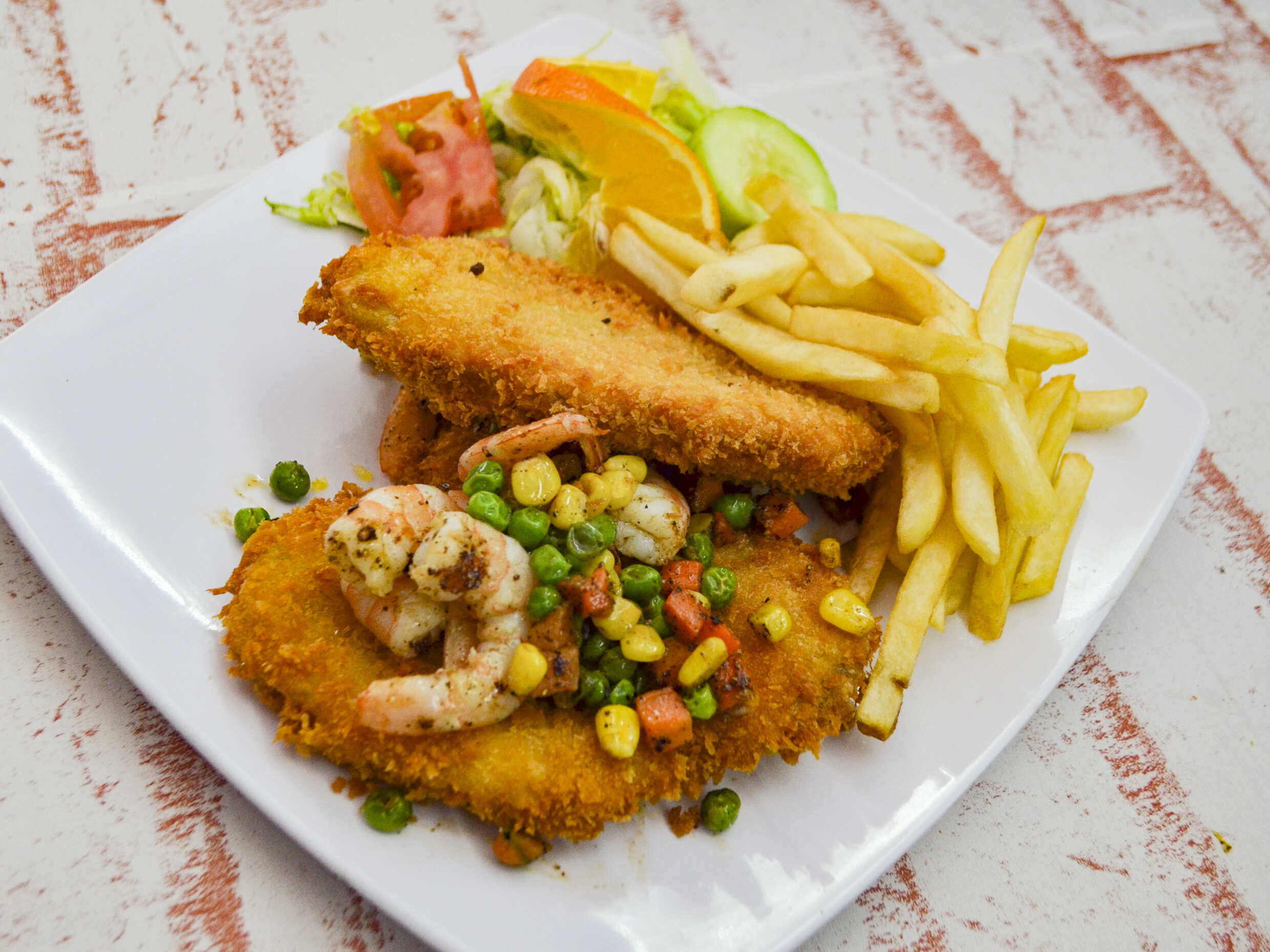Filete empanizado relleno de camaron, pulpo, surimi con vegetales.