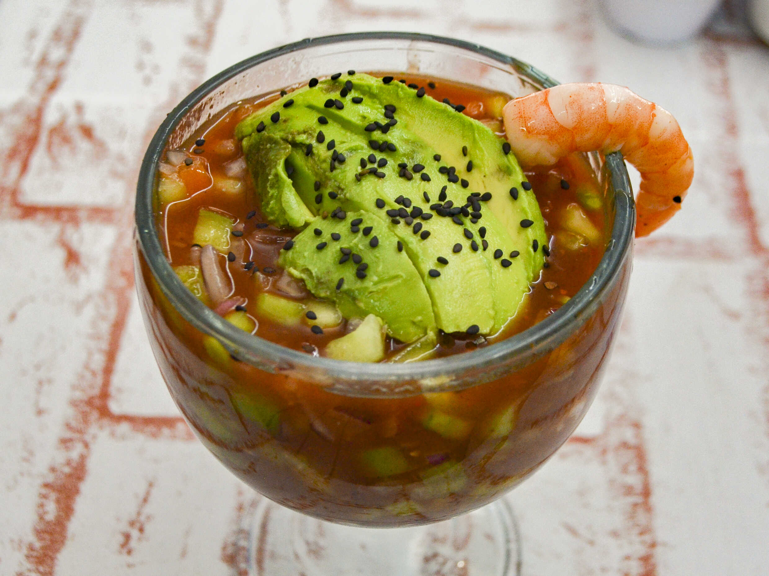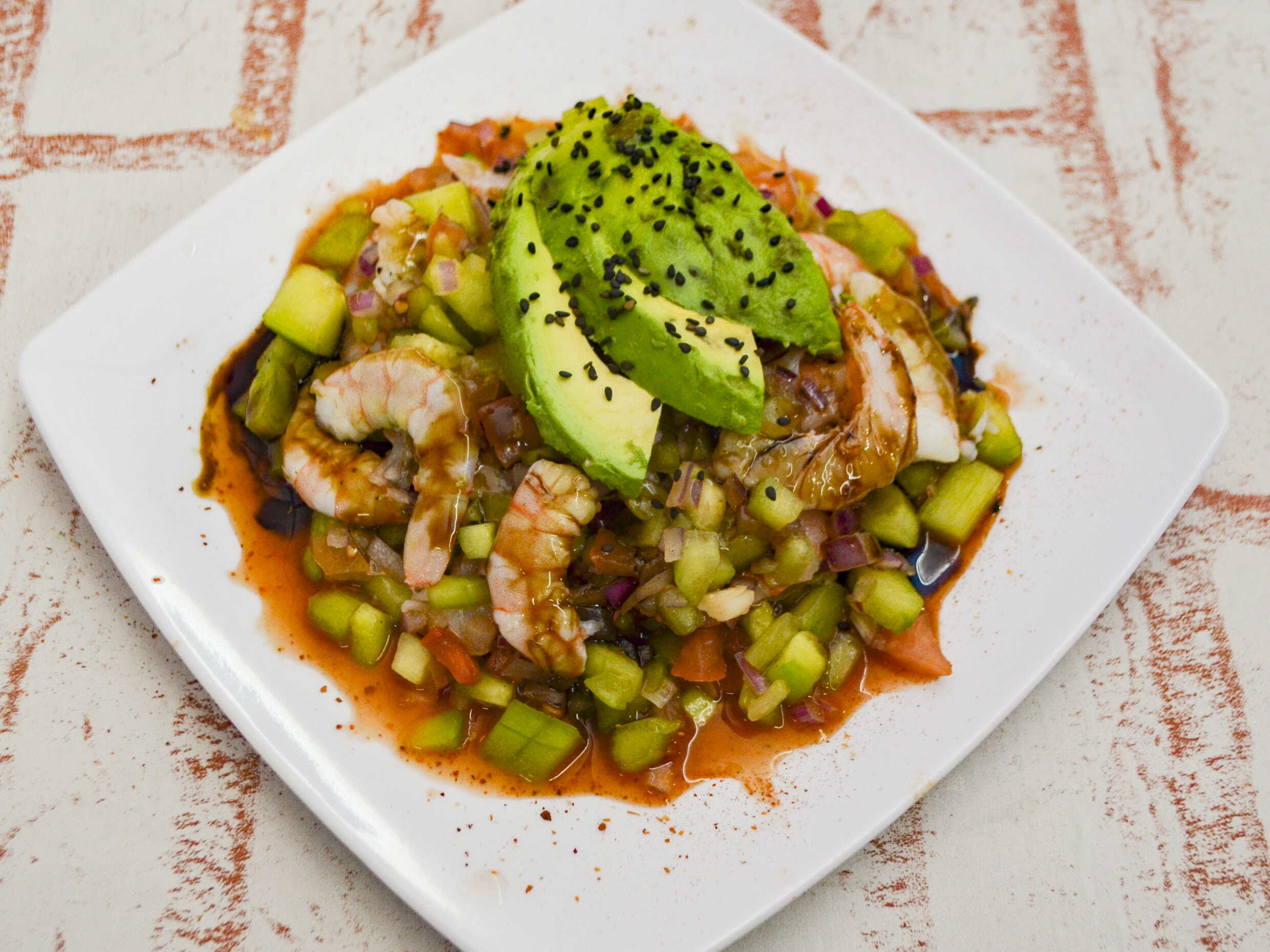 Camaron (10), tomate, cebolla, apio, pepino, aguacate, base de coctel.
