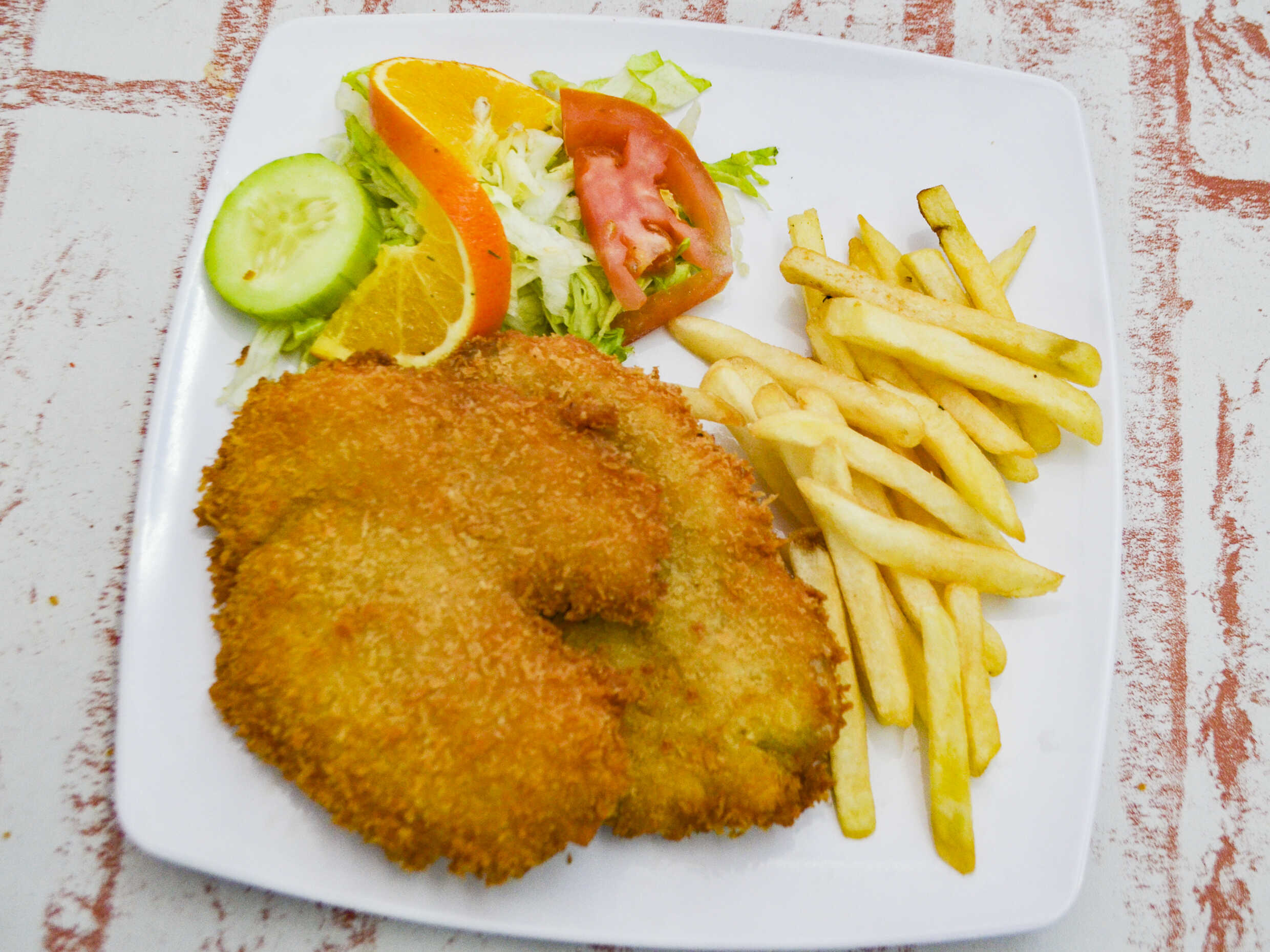 PESCADO EMPANIZADO CORTADO EN TROZOS ACOMPAÑADOS DE PAPAS