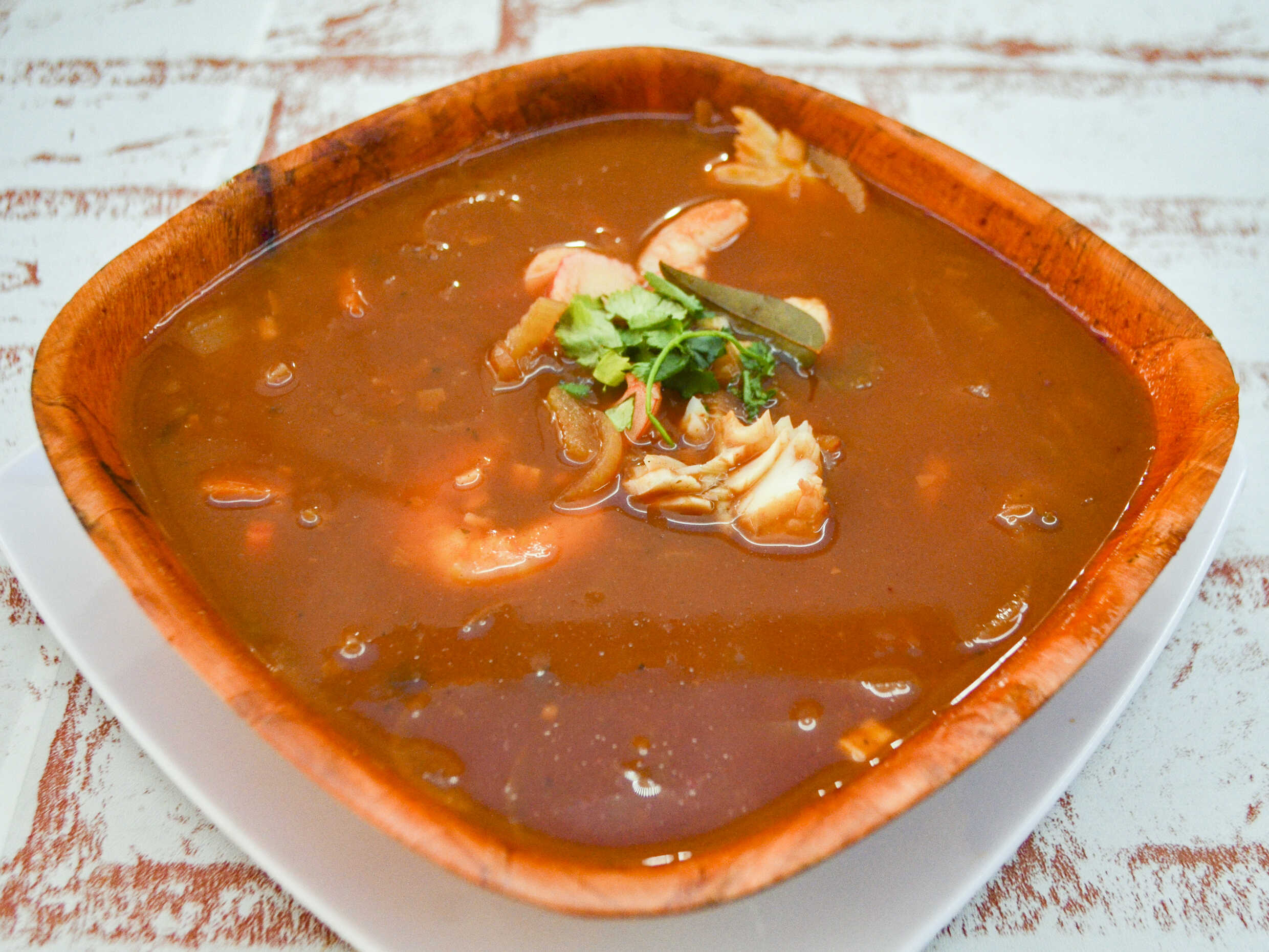 Delicioso caldo de Camaron, filete, pulpo, surimi con apio, cebolla, zanahoria y jalapeño