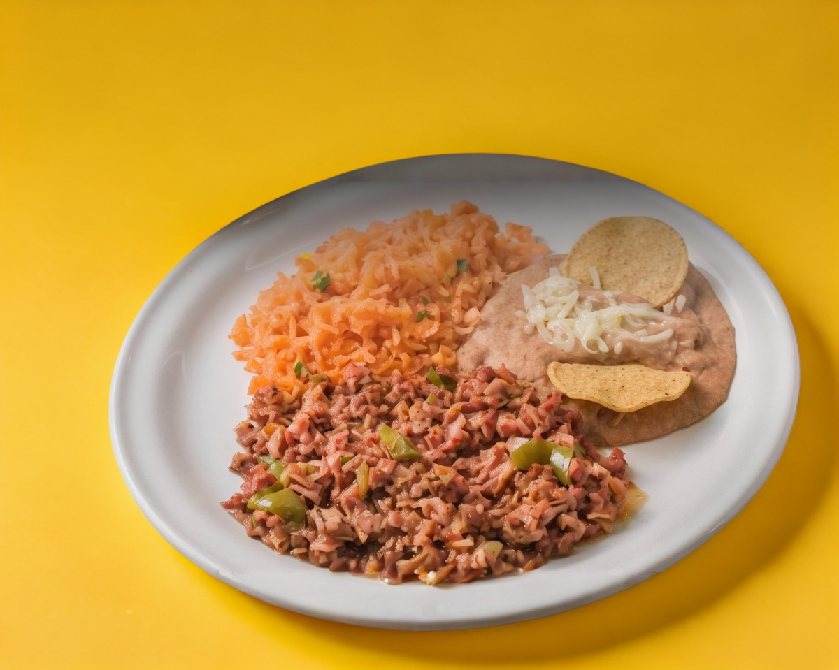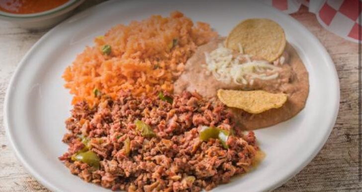 Discada de carne molida con carnes frías. Acompañado de arroz, frijoles refritos, un cuarto de consomé de res, tortillas de maíz y salsa de árbol.