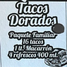 16 tacos dorados+ 1 litro de macarrones + 4 Refrescos de 400 mlls