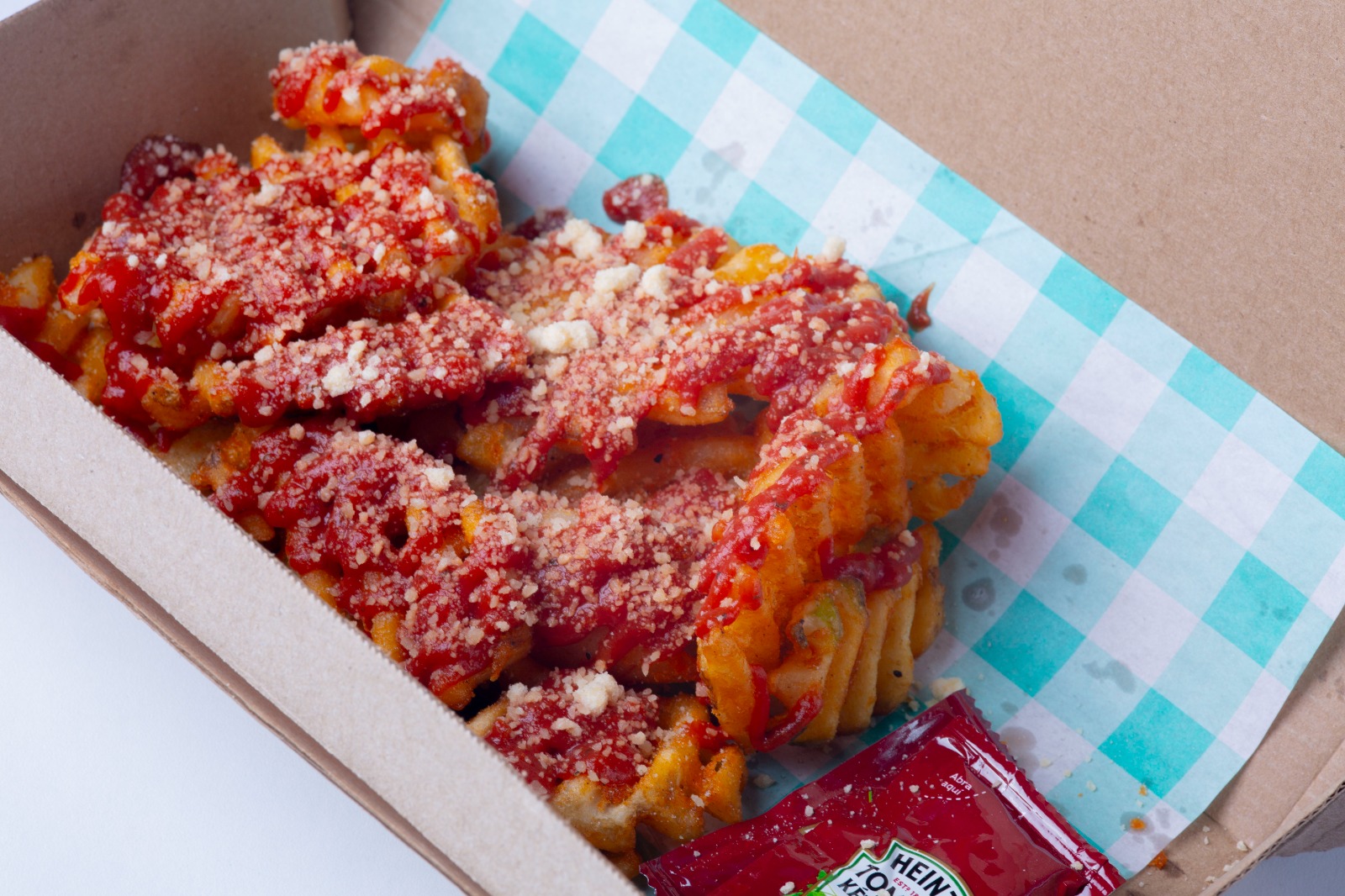 Papas fritas bañadas en salsa de tomate y queso parmesano.