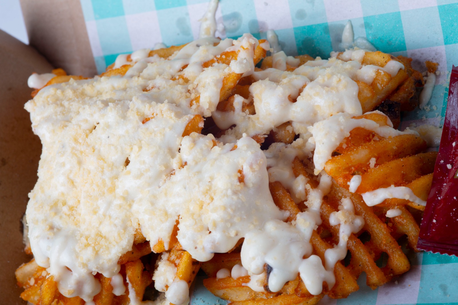 Papas fritas bañadas en salsa alfredo y queso parmesano.