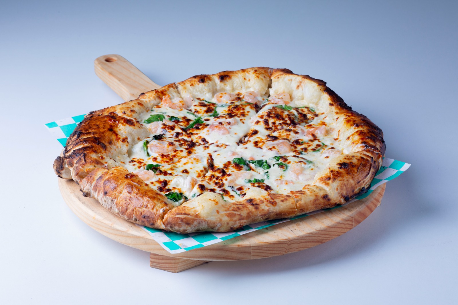 Salsa Alfredo, pollo o camarón, espinacas y mix de quesos, 8 rebanadas, mix de quesos chester y mozzarella.