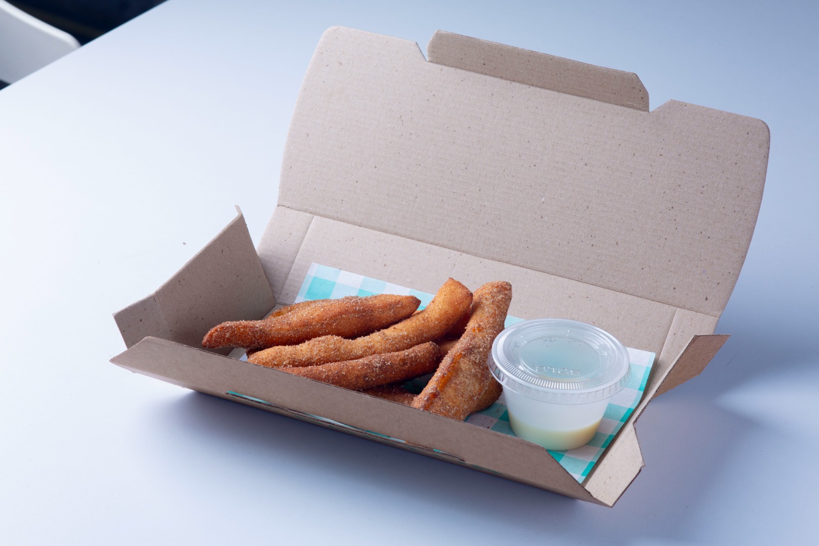 Trozos de masa de pizza fritos con azúcar y un topping a elegir.