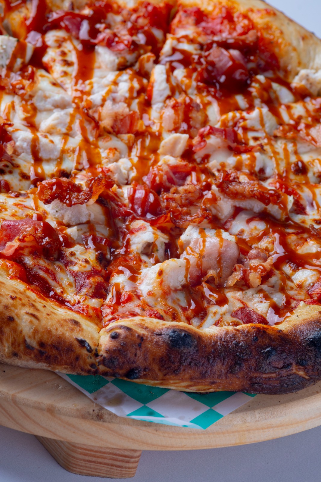 Salsa de tomate y BBQ, pollo, tocino y mix de quesos, 8 rebanadas.