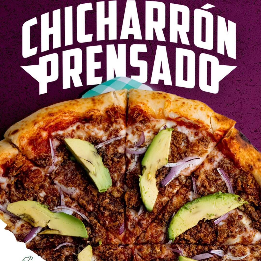 Salsa de tomate, chicharrón prensado, cebolla, aguacate y mix de quesos.