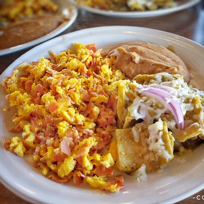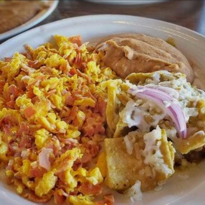 bañados en salsa verde compañados de huevos chorizo, frijoles y topping