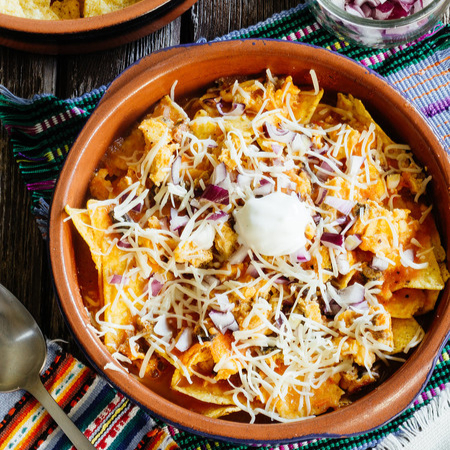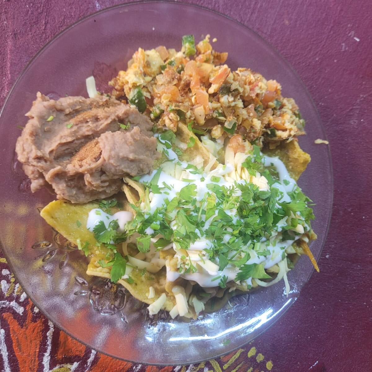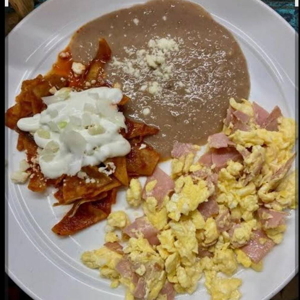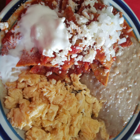 chilaquiles ahogados en salsa roja acompañados de frijolitos refritos, cilantro, cebolla y crema