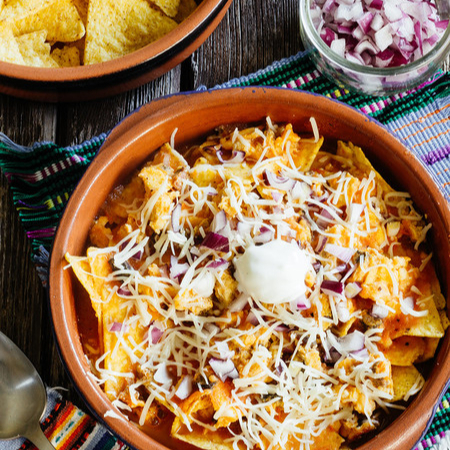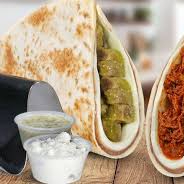 salsa aparte acompañados con frijolitos refritos, queso, crema, cilantro y cebolla