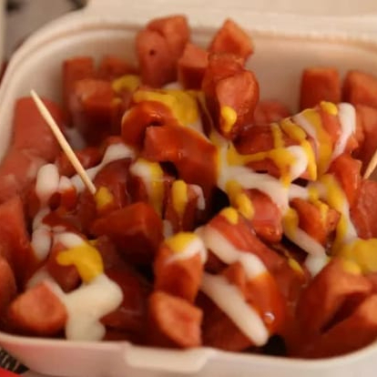 Salchichas fritas bañadas en queso amarillo