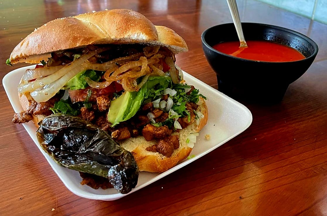 Torta en pan frances extra grande lagunero, acompañada de guacamole y pico de gallo.