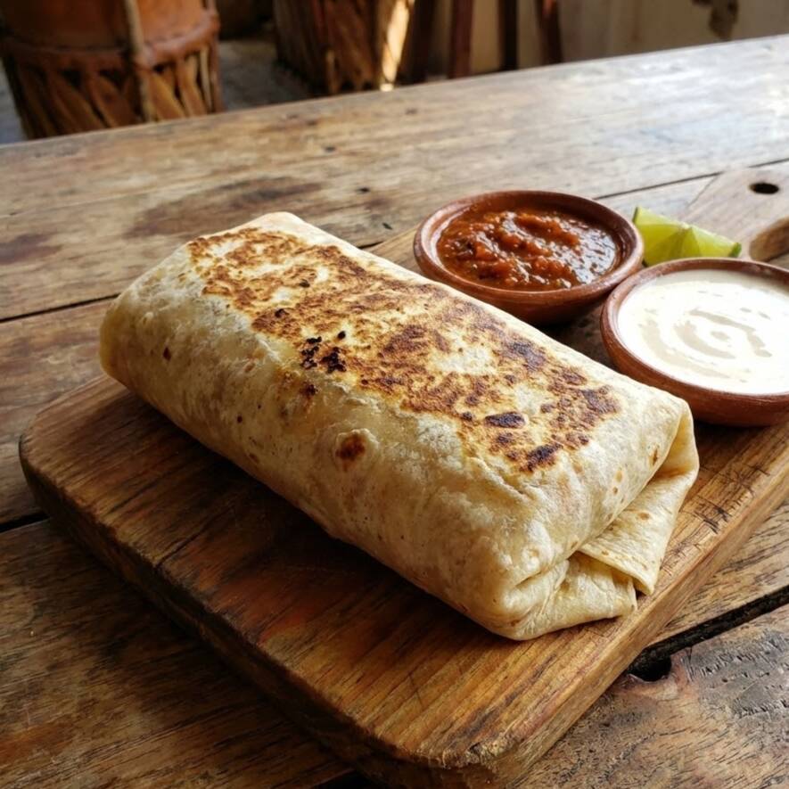 Burrito hecho con tortilla de harina rellena de frijoles con queso asadero.
