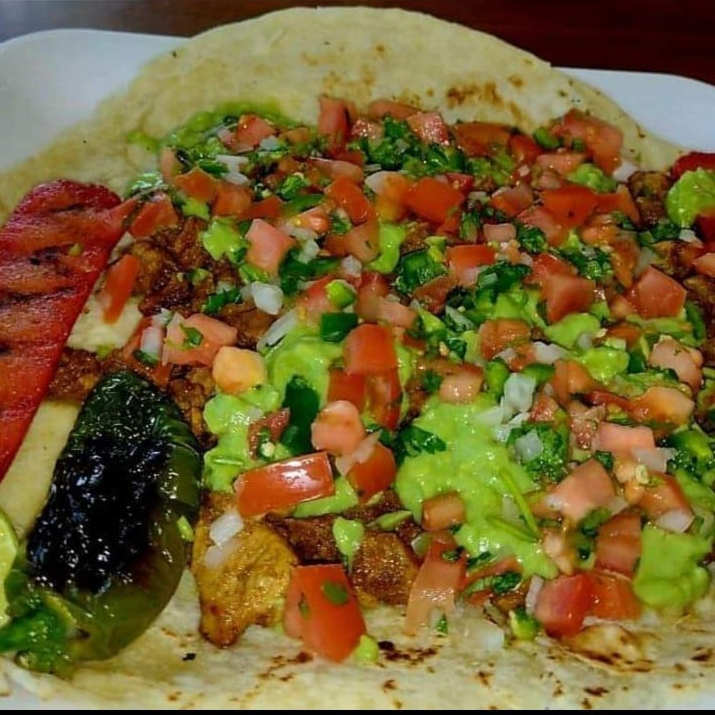 Platillo de bistec gratinado con queso, acompañado de guacamole, pico de gallo, salsa, limon y tortilla de maiz.