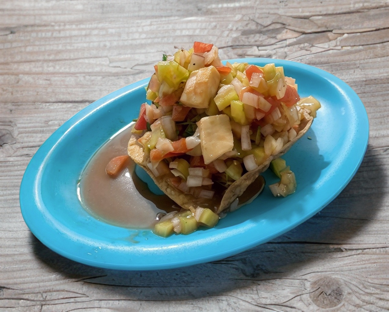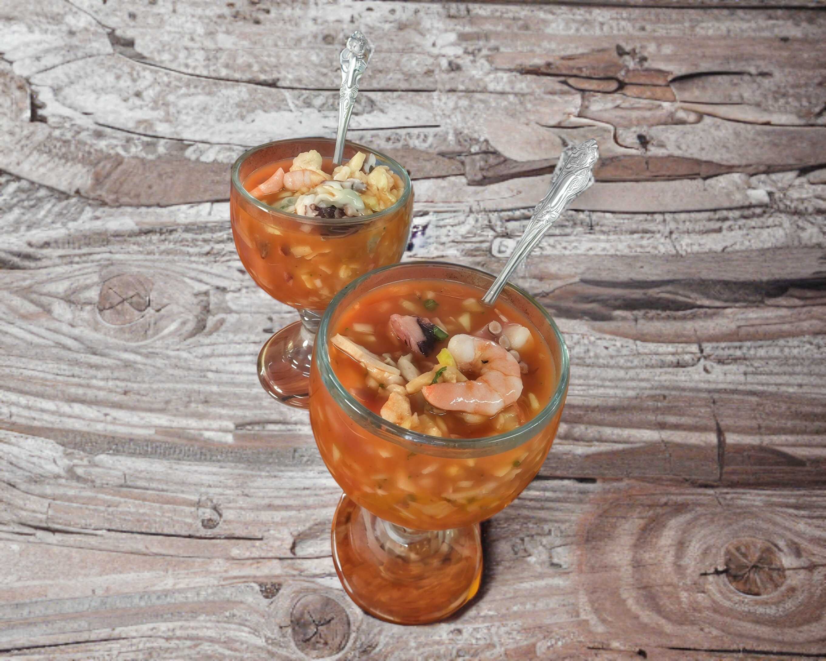 Camarón cocido y crudo, pulpo, callo, cebolla morada y bañada en salsa chiltepín.