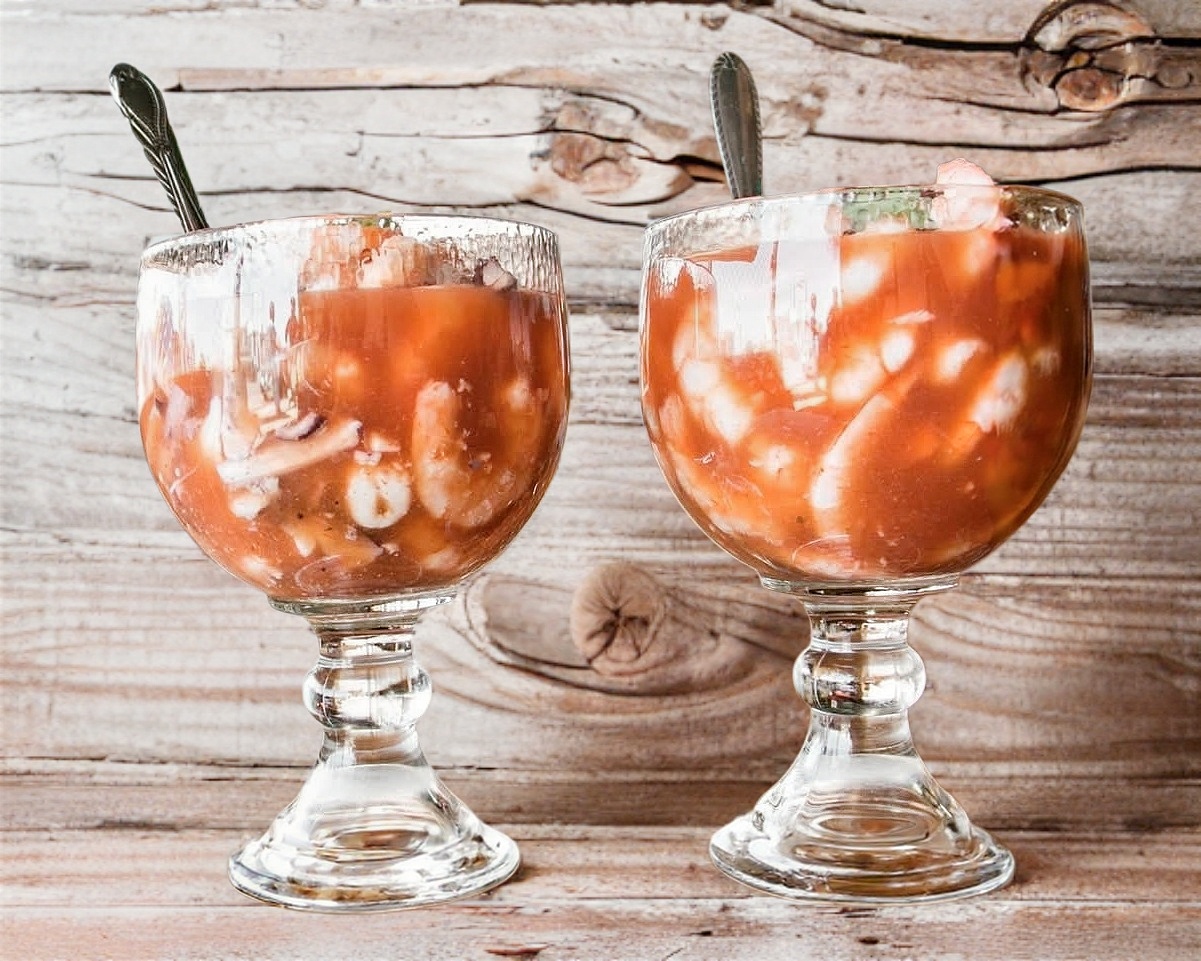 Delicioso coctel de camarón en salsa y acompañados por cebolla, 1/2 Lcilantro y chiles.