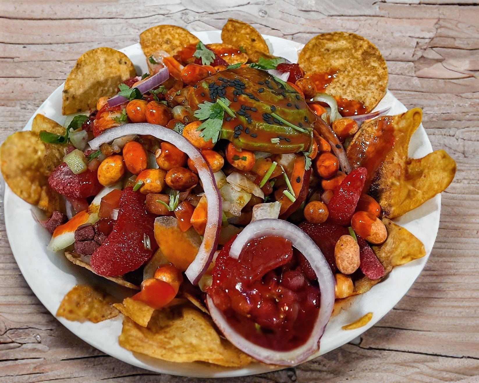 tostitos con ceviche de pescado y camaron, cacahuates, rielitos, cebolla morada, pepino, chamoy y tajin
