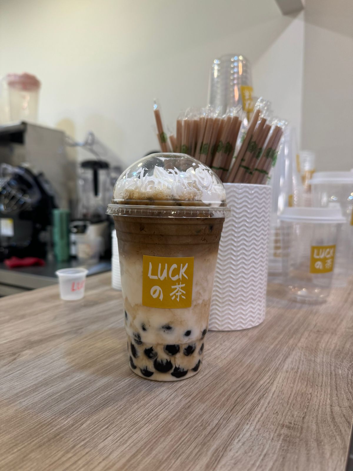 Café y leche fusionados con tapioca negra, creando un sabor único y delicioso.