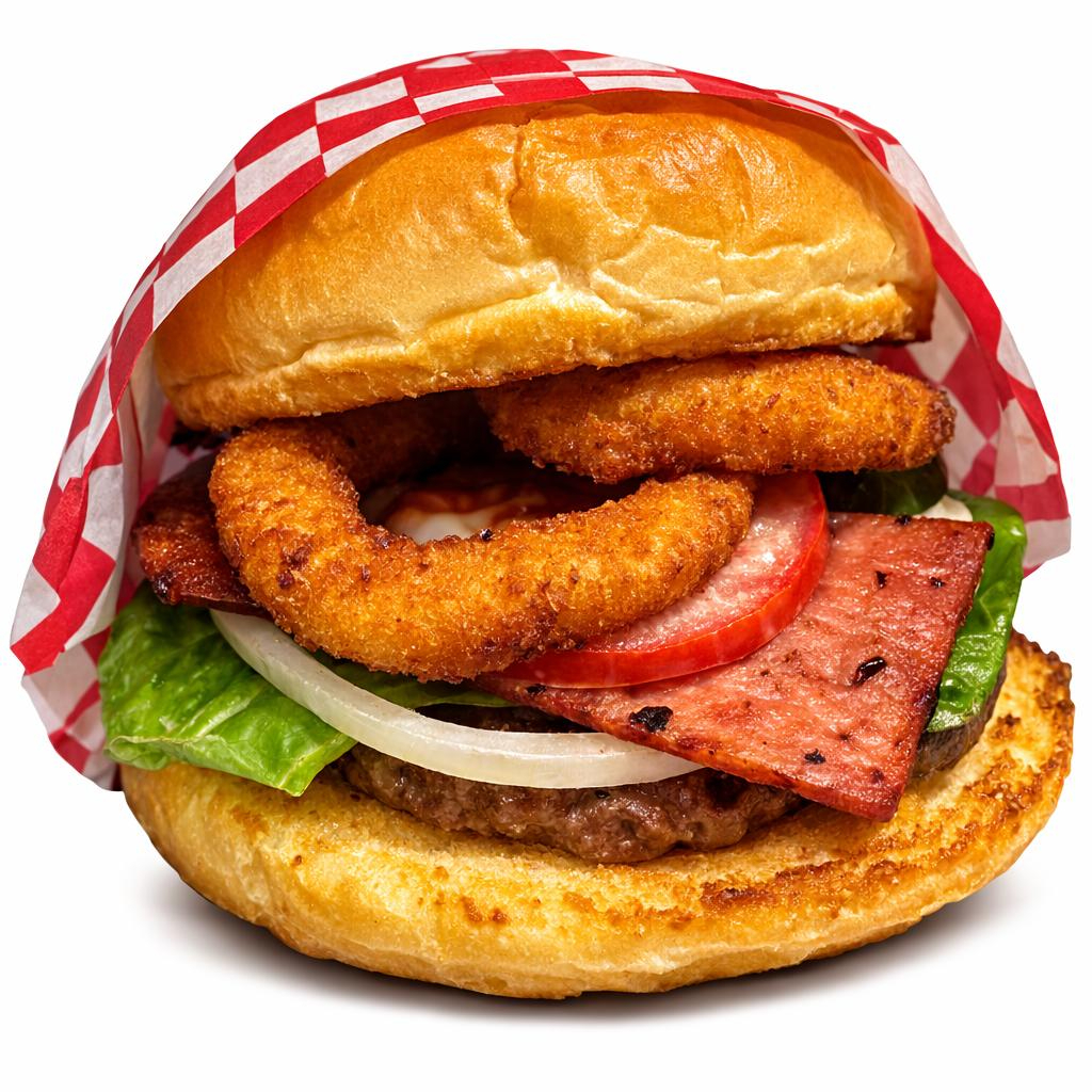Carne de res, 2 Aros de cebolla, Queso amarillo, Tocino, Pan brioche, salsa BBQ.