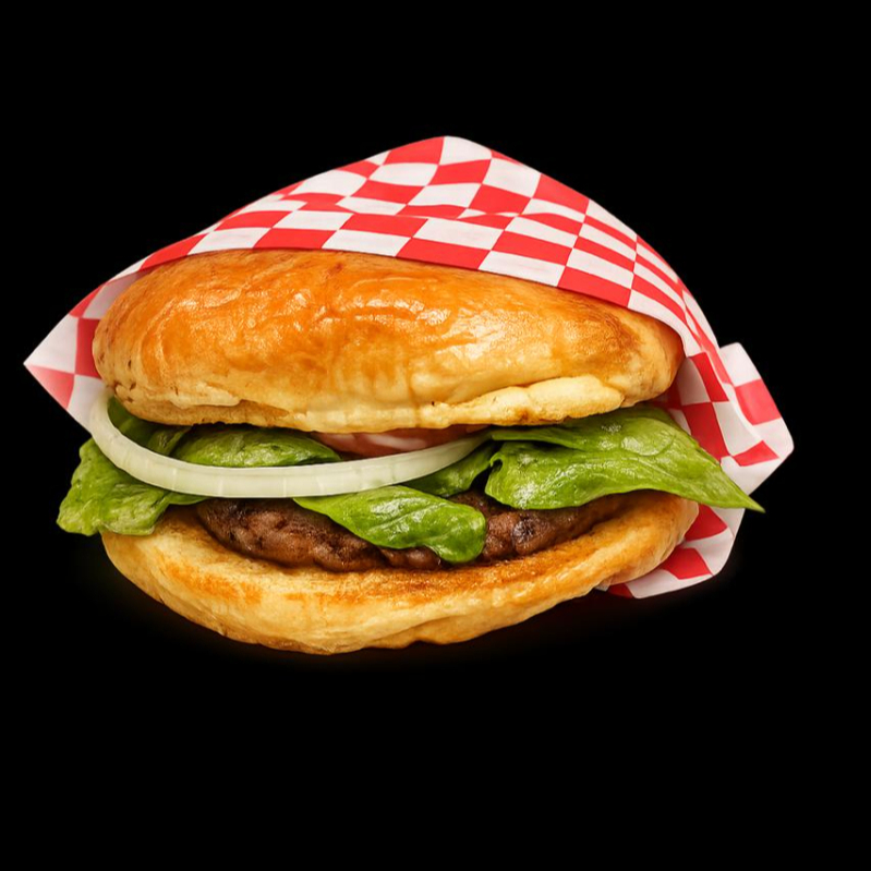 Carne de res, Queso amarillo, Pan brioche, Tomate, Cebolla, Lechuga orejona y aderezo de la casa.