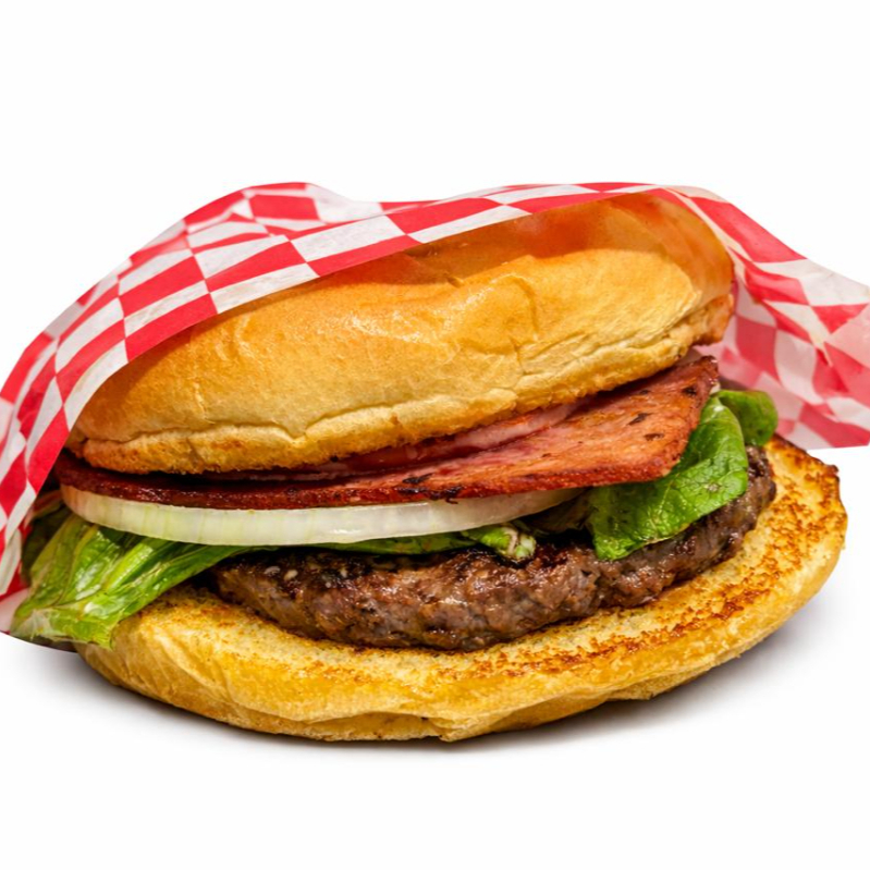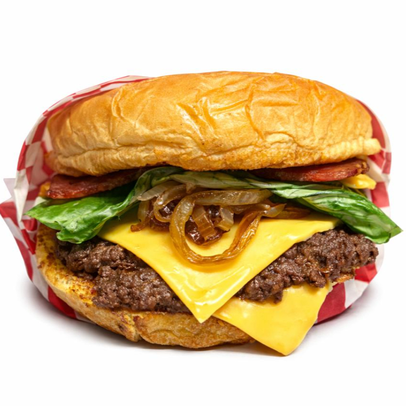 Dos Carnes de res, 2 Quesos amarillo, Pan brioche, Cebolla caramelizada, Tocino, Lechuga orejona.