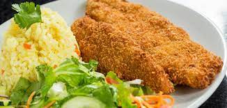Con papas arroz y ensalada.