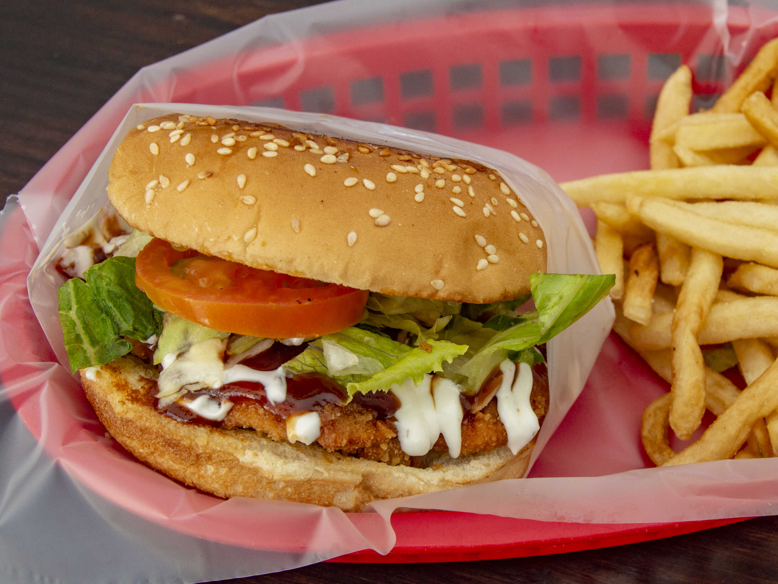 Pechuga de pollo empanizado, tocino, queso, verdura y aderezos.