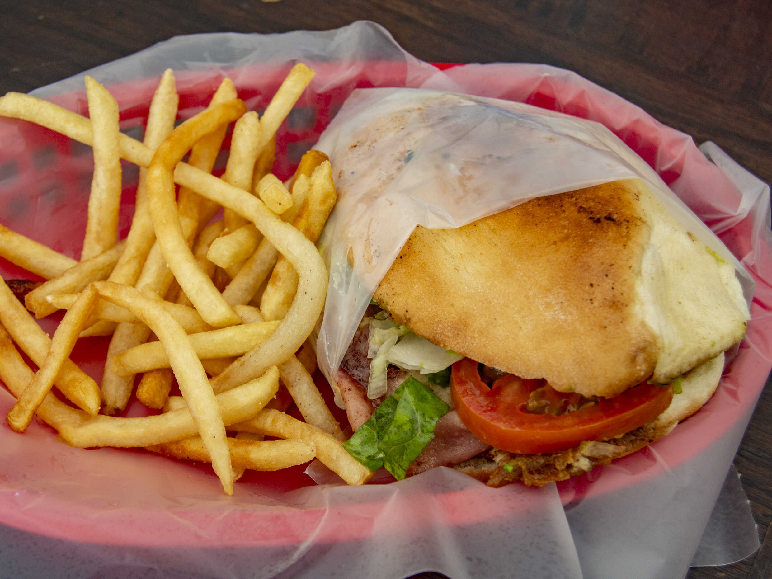 Pechuga de pavo, tocino, queso, tomate asado y aderezos en pan baguette.