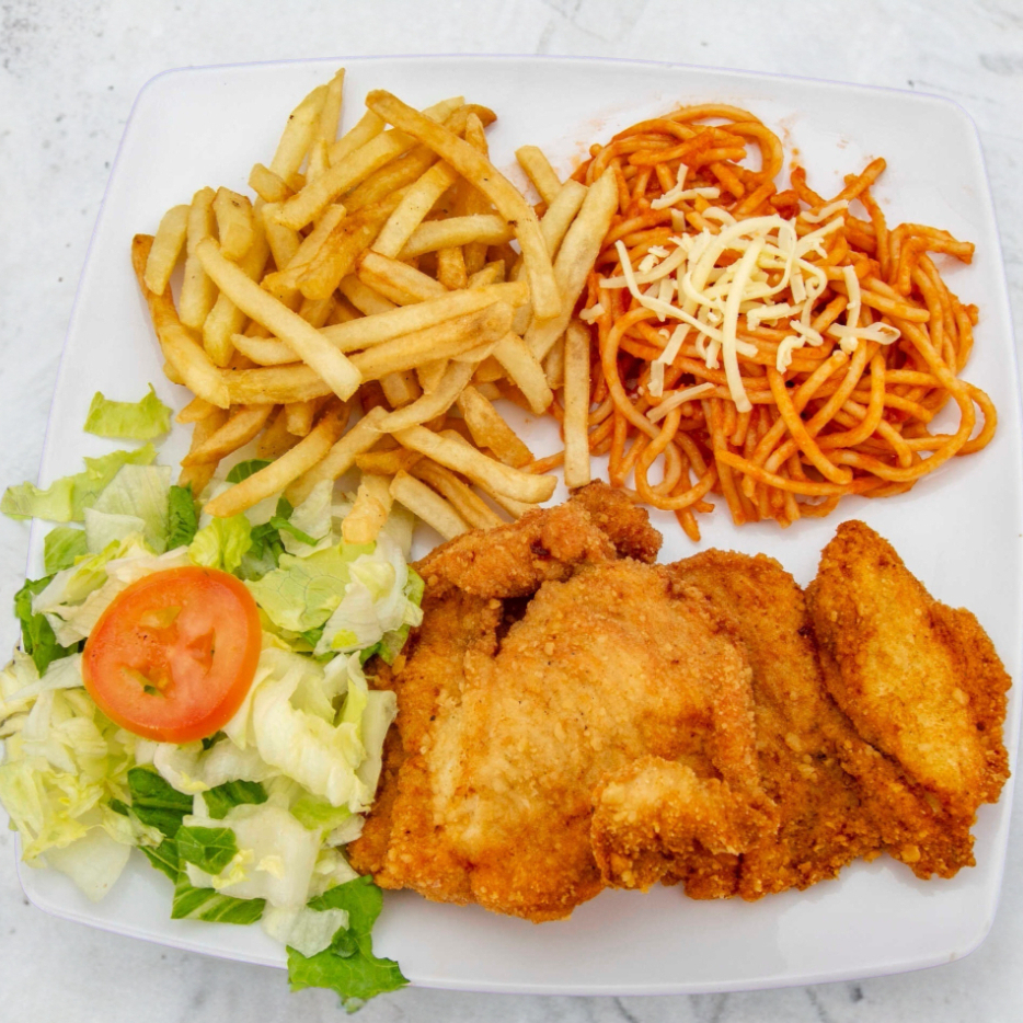 Acompañada de Spaghetti, Papas Francesas y verduras. + Gratis Agua de Sabor